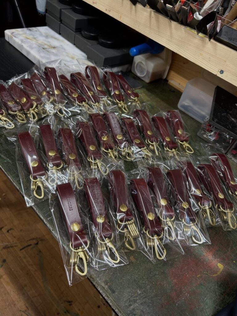 還暦と言えば赤いチャンチャンコだと思いますが、その時ばかりで実用性が無いとの事で赤い革のキーホルダーをお揃いで記念品にと製作させて頂きました。